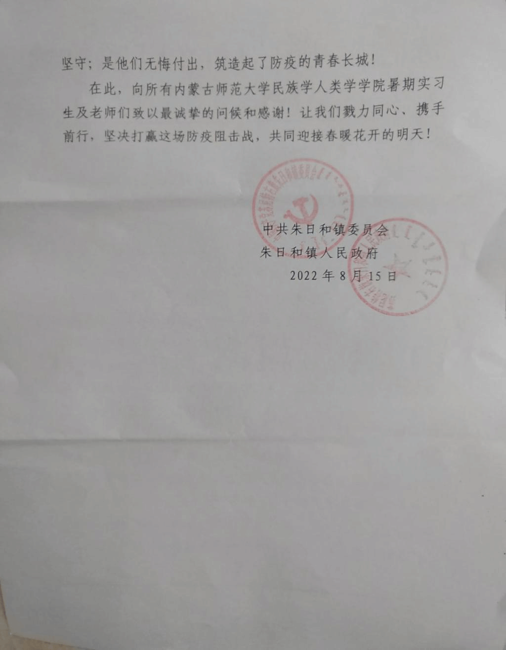 近日,苏尼特右旗朱日和镇人民政府向bat365发来感谢信,对bat365中文官方网站田野调查师生在新冠肺炎疫情防控中的突出贡献表示感谢,赞扬bat365师生在疫情防控中表现出的挺身而出、主动作为、无私无畏、勇于担当的精神风貌。