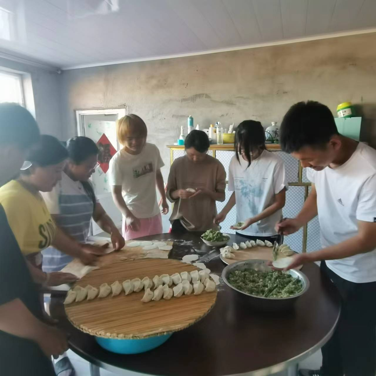 哈日巴召村的两组同学与家庭成员包饺子聚餐