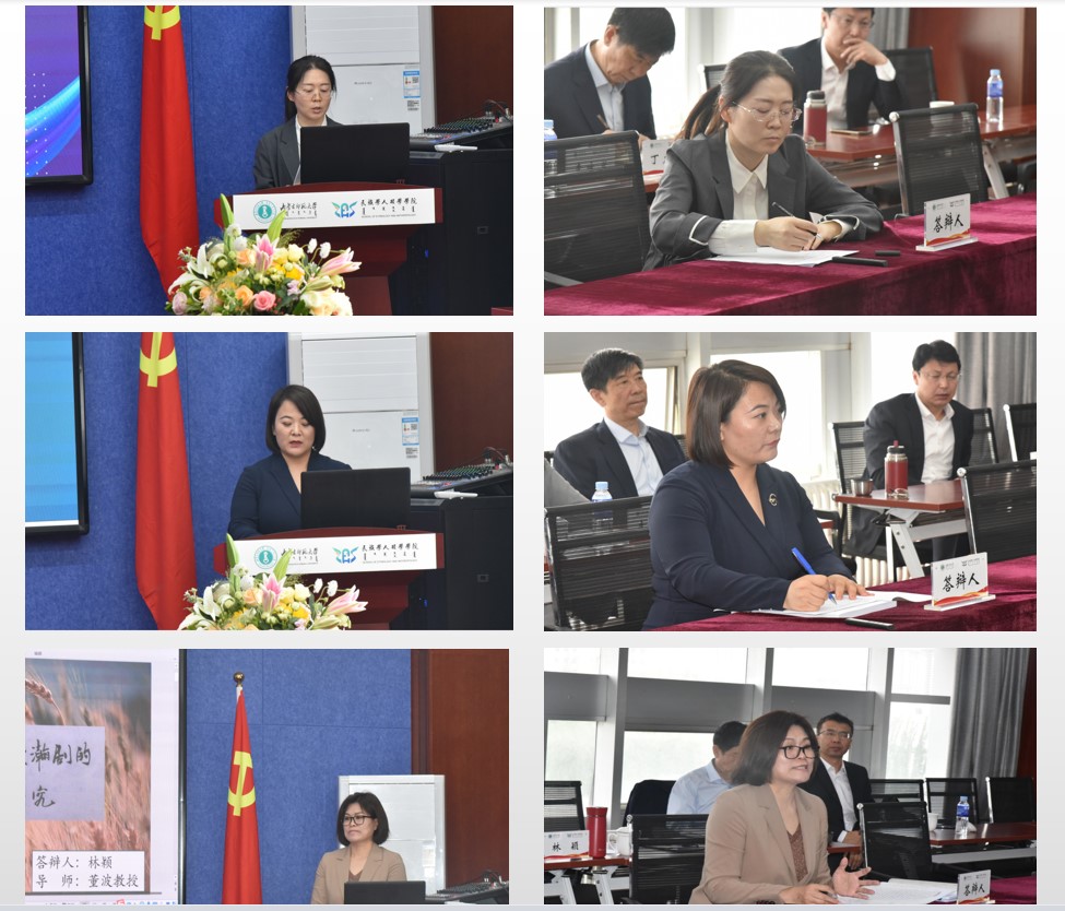 论文答辩人李丽萍(导师丁龙召教授)、于会新(导师是李咏兰教授)、林颍(导师董波教授)分别对论文《新时代鄂尔多斯市民族交往交流交融实证研究》《民族学视域下牧区老年疾病研究——以鄂温克族自治旗为个案》《文化融合视阈下漫瀚剧的艺术人类学研究》的论文选题、框架、文献研究、研究方法和创新点等依次汇报。