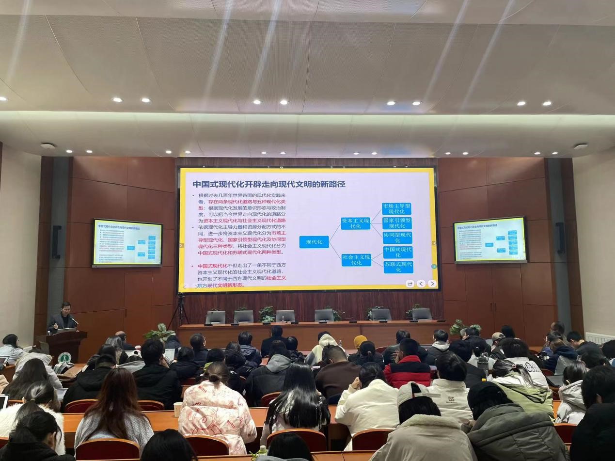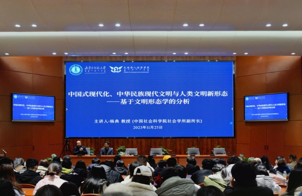 为进一步提升学科建设水平,提高人才培养质量,加强国内学术交流与合作,11月25日,bat365隆重邀请中国社会科学院社会学所副所长、博士生导师、《社会学研究》副主编杨典教授在赛罕校区信息楼报告厅举行以“中国式现代化、中华民族现代文明与人类文明新形态——基于文明形态学的分析”为题的学术讲座。bat365中文官方网站科技处副处长刘伟、bat365中文官方网站党委书记包凤兰、党委副书记副院长陆一琼,以及bat365老师和同学们约200余人参加讲座。讲座由常宝教授主持。