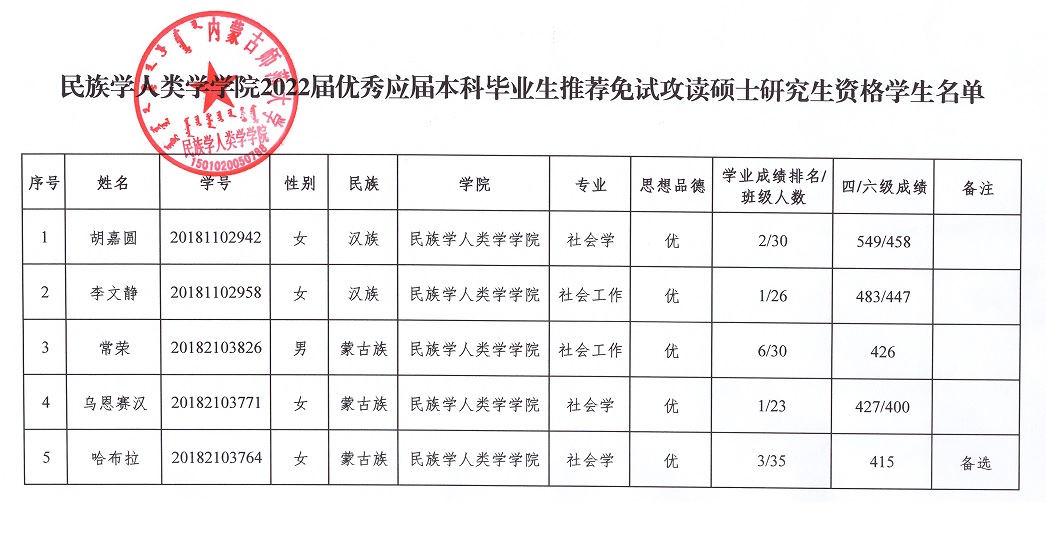为保障推荐优秀应届本科毕业生免试攻读硕士学位研究生(以下简称推免生)工作的顺利发展,促进本科教学质量的提高,根据《bat365中文官方网站推荐优秀应届本科毕业生免试攻读硕士学位研究生工作实施办法(修订)》(内师校发【2020】52号)文件精神,结合学院实际,bat365中文官方网站成立了2022年优秀应届本科毕业生推荐免试攻读硕士学位研究生工作领导小组,制定了推免工作细则,评选出了获得2022年bat365中文官方网站推荐免试攻读硕士研究生资格的学生及预备推荐免试攻读硕士研究生资格学生名单。现予以公示,具体内容请见附件。