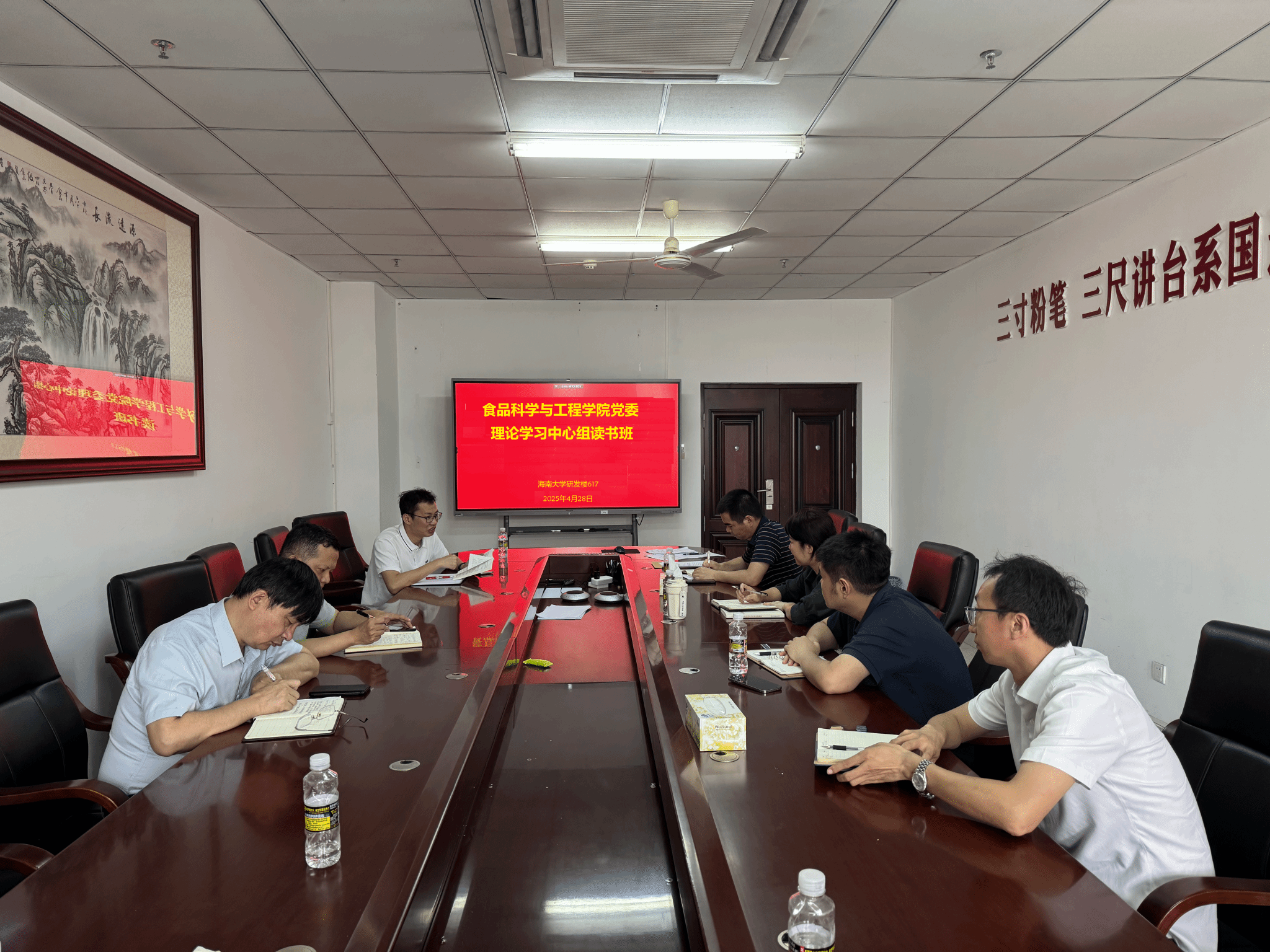 4月28日上午在研发楼617会议室,pg国际电子网站党委理论学习中心组举行深入贯彻中央八项规定精神学习教育读书班暨理论学习中心组学习会,深入学习“习近平总书记关于加强党的作风建设的重要论述和中央八项规定及其实施细则精神”。学院党委书记邢红斌主持会议,理论学习中心组全体成员、各支部书记参加会议。