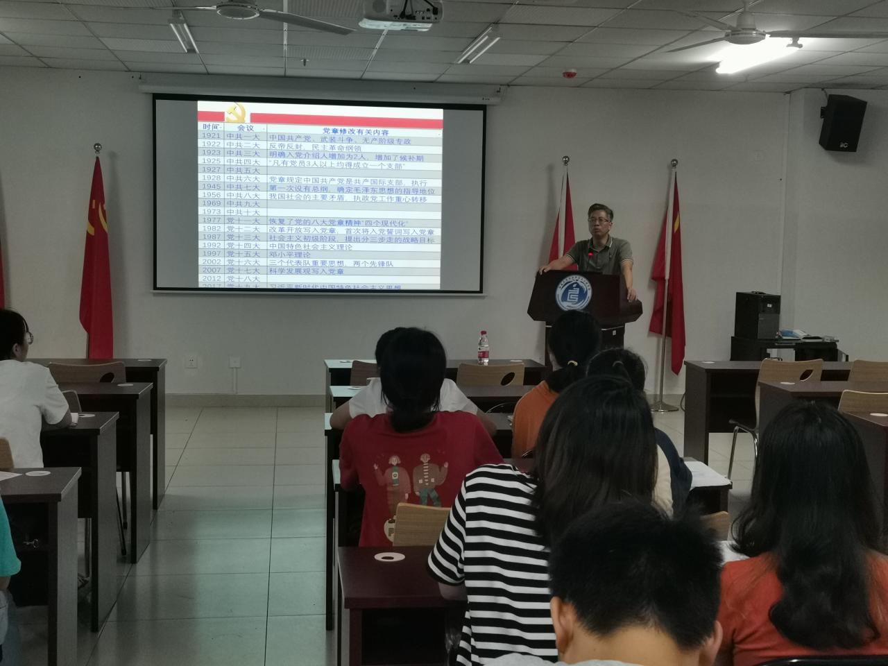 开班仪式后,党委书记邓秀成以“坚定信念,牢记宗旨,做信仰坚定的大学生党员”为主题开始党课第一讲。邓书记以《中国共产党章程》为主要内容,结合学习党的历史,从党的指导思想、党的性质、党的宗旨、党员先锋模范作用发挥等方面进行讲解,进一步加深发展对象对党的历史和传统、党的基本理论和基本知识的理解,提高发展对象政治素质,真正做到端正入党动机,自觉从思想上入党。