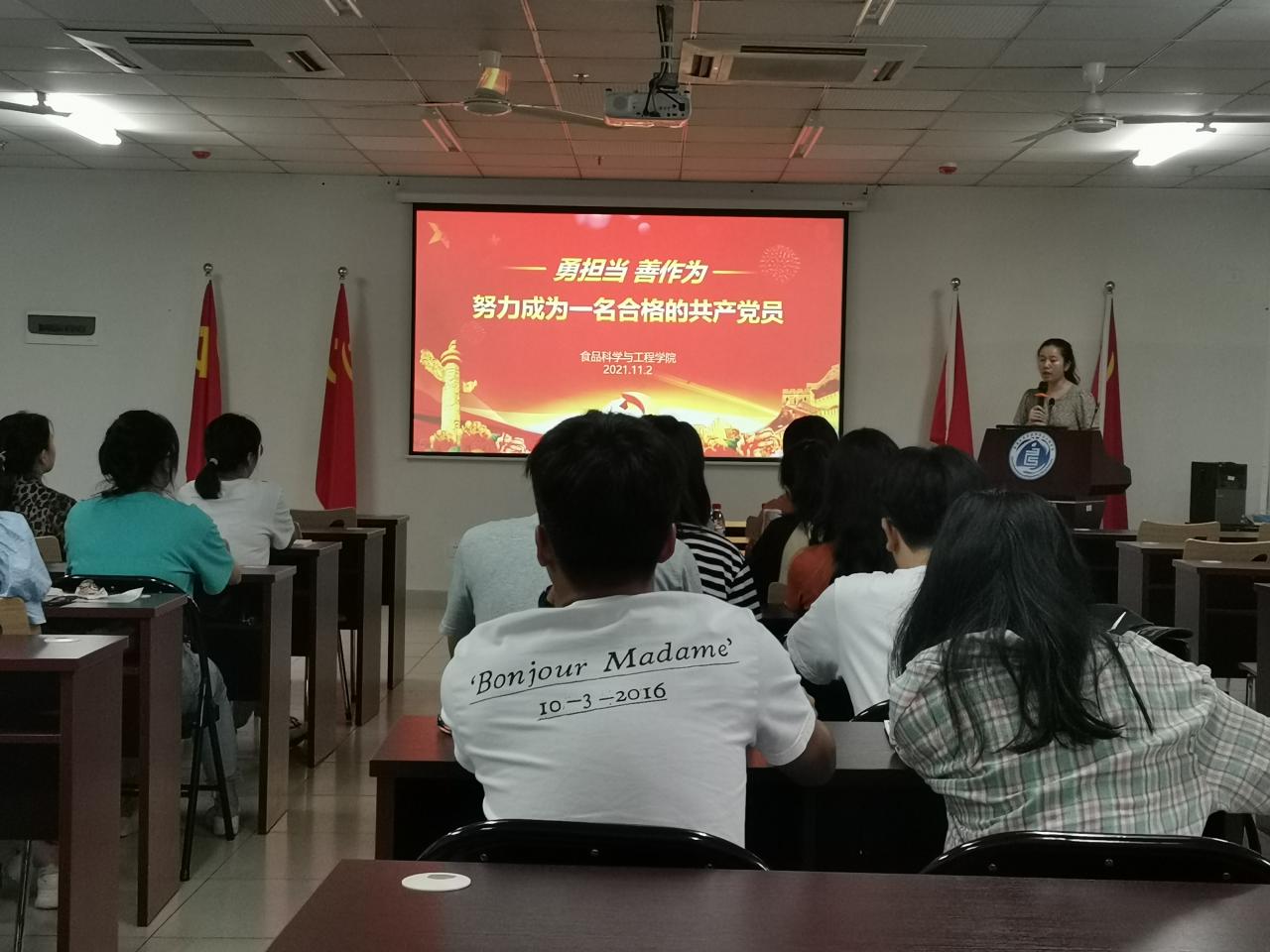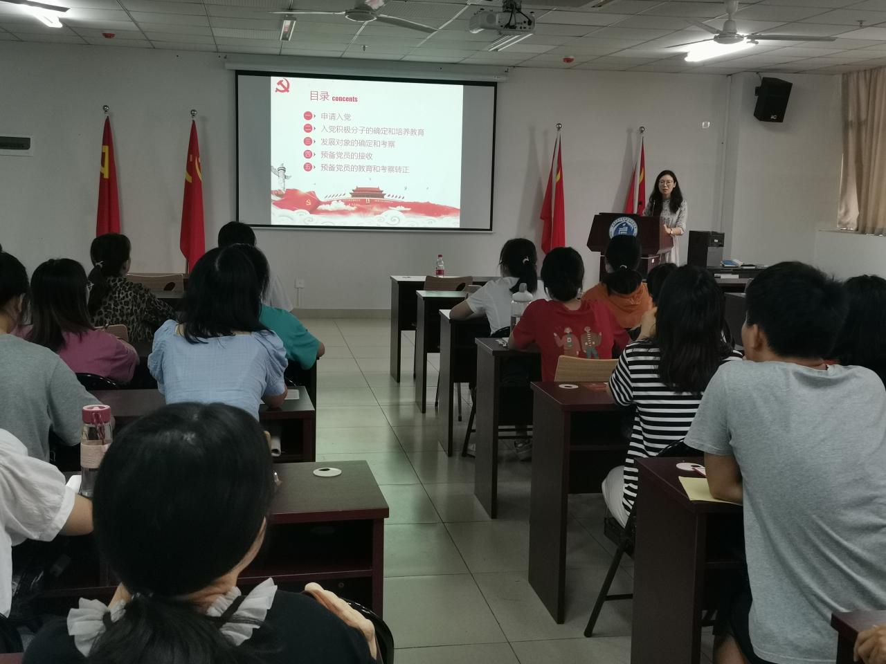 支部书记李丹老师主讲“勇担当、善作为,努力成为一名合格的共产党员”专题党课,带领学员们探讨如何从组织上、思想上、行动上早日成为一名合格的共产党员。支部书记杨玉珅老师讲解了入党的条件、程序和要求,以及入党材料的撰写要求。培训最后,培训班学员合影纪念。