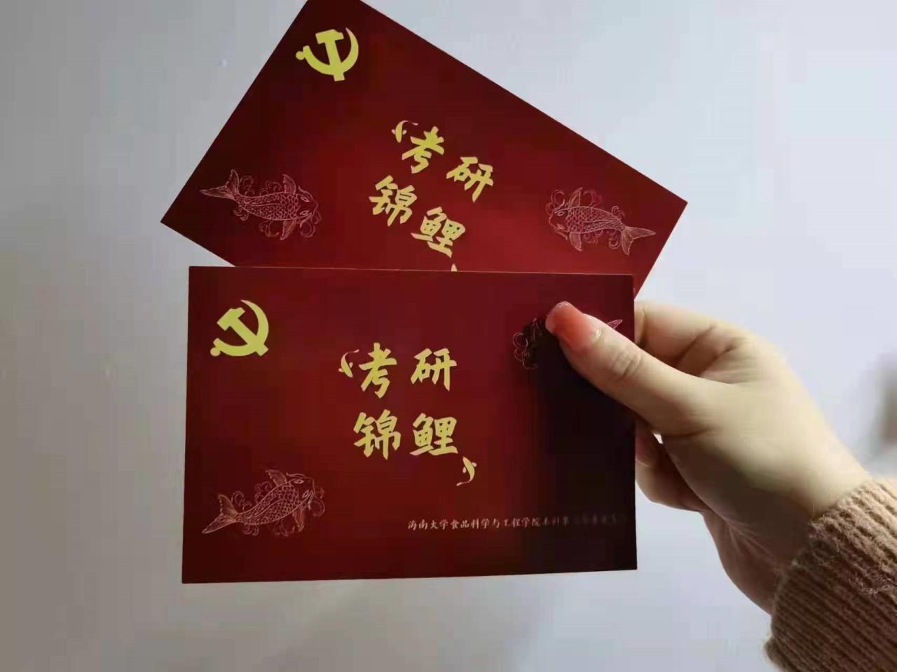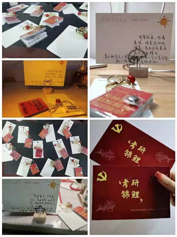 为增强支部考研党员的信心,同时充分调动学生党员为同学服务的积极性,12月12日至13日pg国际电子网站本科第二学生党支部开展“研途送温暖”活动。活动开始前,支委为考研党员同志购买明信片和纪念钥匙扣。12月12日中午,支部其他党员一起为考研的党员同志书写句句祝福话语,默默派送到每个考研党员同志的宿舍书桌,精心地准备温暖的小惊喜。本次为考研党员同志送温暖活动,不仅以正能量的方式激励了考研学子,鼓舞奋战考研的学子们以积极的心态投入备考冲刺阶段,也彰显了党支部的人文关怀,有助于营造支部团结温馨的氛围。辛苦学习了一天回到宿舍的党员同志们在看到书桌上的纪念品和卡片,纷纷表示感动和感谢!