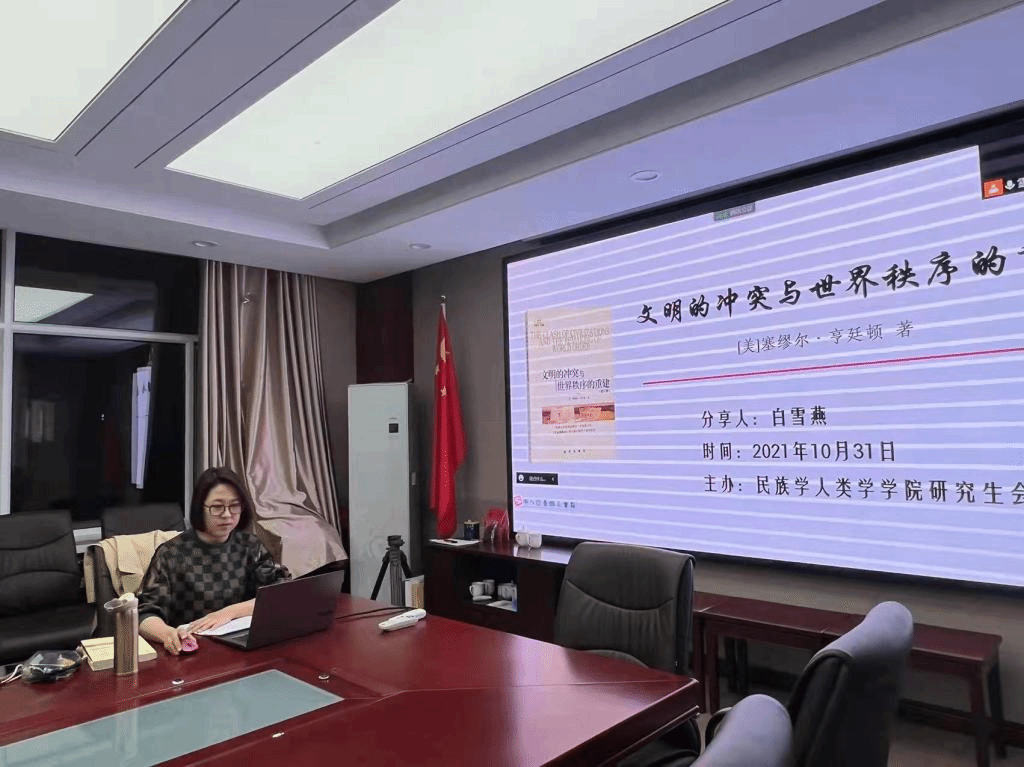 bat365中文官方网站21级博士研究生第2期读书报告会于2021年10月31日晚19点在田楼607会议室举行,21级博士研究生全员参加本次报告会。本次读书报告会采取线上和线下两种方式同时进行,方便校内校外住宿的同学一并参与学习讨论。本次读书报告会的汇报书目是《文明的冲突与世界秩序的重建》,主讲人为马克思主义民族理论与政策专业博士研究生白雪燕同学。