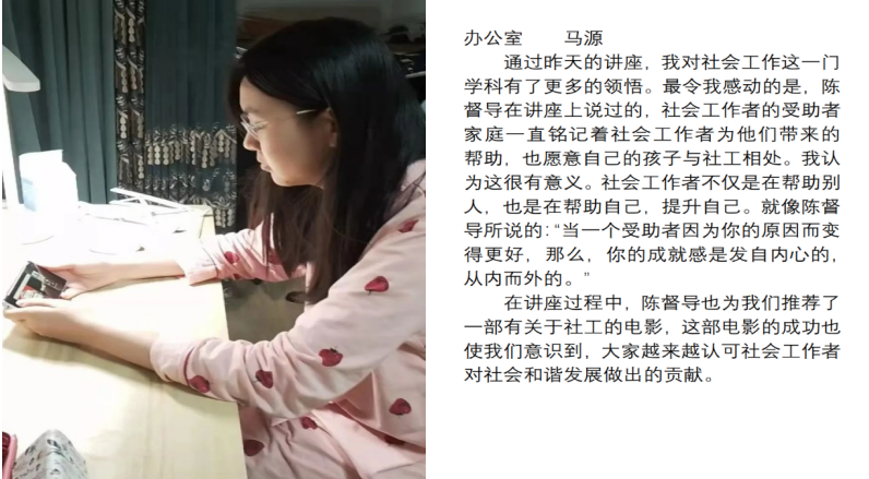 3月16日晚20:00~21:00,第九届社会工作服务站以线上形式组织观看了由道宁会客厅主办的,以“香港督导支持内地社工培养历程”为主题的线上交流讲座。社工站的同学们通过手机,电脑等方式观看了讲座并交流讨论了自己的心得感悟。