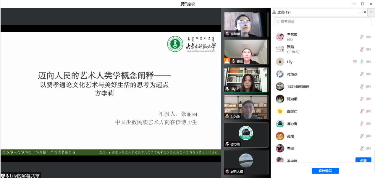张丽丽同学阅读分享的论文为《迈向人民的艺术人类学概念阐释——以费孝通论文化艺术与美好生活的思考为起点》(《民族艺术》2019年01期),该论文以费孝通先生关于人类文化艺术和美好生活思想的阐释为主线,论述了通过艺术研究的途径,聚焦社会发展的现实问题,致力于解决当前的社会发展中的文化艺术问题。