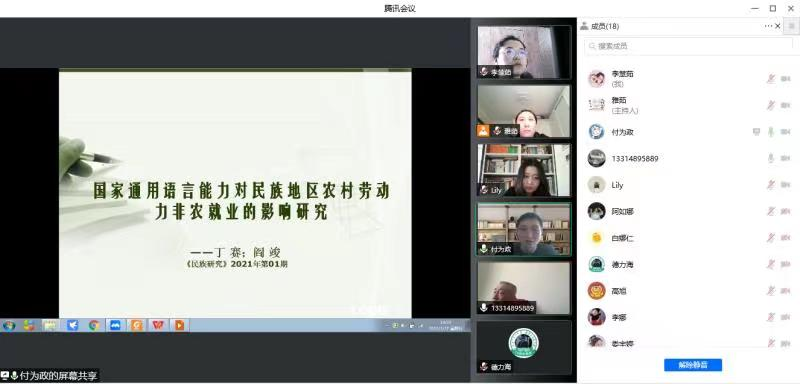 付为政同学阅读分享的论文是《国家通用语言能力对民族地区农村劳动力非农就业的影响研究》(《民族研究》2021年01期)一文。分享者首先介绍了论文作者、该研究主题相关文献的概况,然后对作者的写作思路、论文创新性等方面作了概述。其中,强调了作者立足于民族交往交流交融及铸牢中华民族共同体意识的研究视角。最后,详细介绍了论文的主要研究内容和研究结论。该论文是一篇典型的将国家通用语言能力纳入经济学领域考察的实证研究型论文。