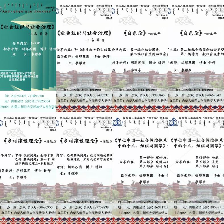 本学期读书报告会在胡那苏图老师的指导下,共进行了4本相关书籍的阅读分享。王名教授的《社会组织与社会治理》,本书指出社会体制的改革及社会治理现代化比国家治理体系将更加广泛、复杂和艰难,因而需要更加渐进乃至反复的过程,加之经济体制改革在总体上已经成功及其揭开和积累的大量社会问题,使得这一过程具有更为强烈的现实性和紧迫性。涂尔干的《自杀论》,作者在书中批判了以个体心理学解释自杀现象的传统理论,建立了用社会事实的因果关系分析自杀的理论,阐述了社会与个人的关系。当个体同社会团体或整个社会之间的联系发生障碍或产生离异时,便会发生自杀现象。梁漱溟先生的《乡村建设理论》,从认识和解决中国社会问题入手,系统地阐述了对中国社会改造与乡村教育关系的思想。以乡村为中国文化之本的思想,以及通过教育手段来改造半殖民地半封建社会组织结构,培养新伦理,建设新礼俗的思想,都是对中国社会根本问题思考的积极实践。刘建军先生的《单位中国——社会调控体系重构中的个人、组织与国家》,本书从政治学的角度对单位组织和单位体制进行系统研究,从中可以看到单位和单位体制在多大程度上满足了中国现代化的需要,又是在何种条件下蜕变为现代化的阻滞力量。