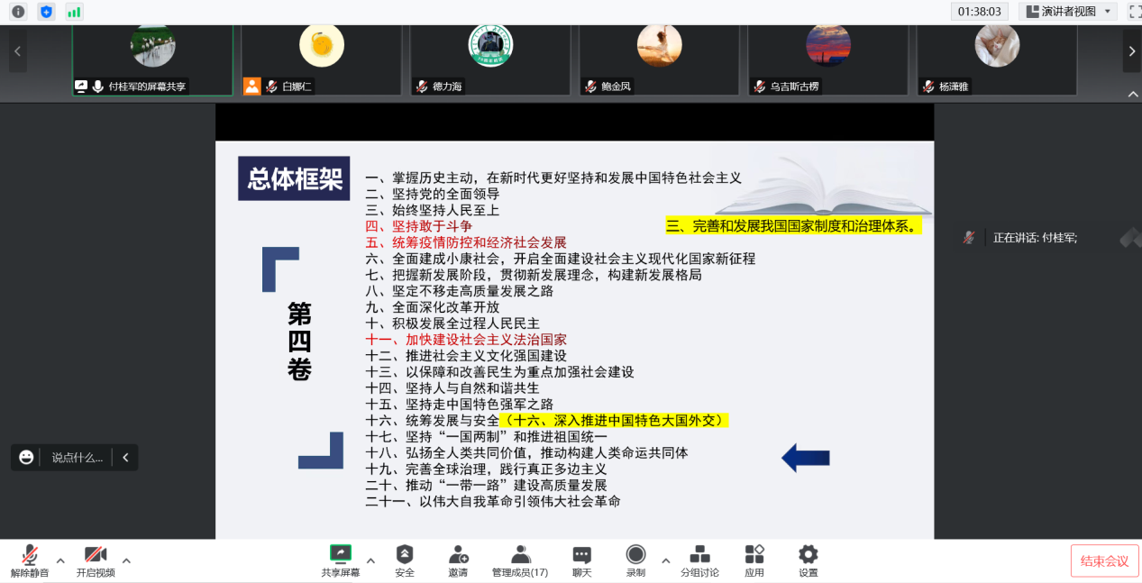 付桂军同学与大家分享了《习近平谈治国理政》第四卷。分享内容主要包括推荐缘由、内容框架和学思感悟。首先,从文章数量、专题数量、图片数量和时间跨度等四个方面对《习近平谈治国理政》第一卷到第四卷做了统计,对比了数字上的变化,也展现了各卷的主要内容和重点内容。接着对第四卷的总体框架内容进行解读,在政治建设、五位一体、保障条件和两大革命四大板块做了篇目数量的权衡。尤其将第四卷的内容与党的二十大报告相结合,探讨相互联系,对新提法做了详细的介绍。最后,学思感悟中,从指导思想笃行、原著精神躬行、未来征程前行三方面做出总结。习近平新时代中国特色社会主义思想是当代中国马克思主义、二十一世纪马克思主义,是中华文化和中国精神的时代精华,实现了马克思主义中国化新的飞跃;坚持读原著、学原文、悟原理、知原义,全面系统学、及时跟进学、深入思考学、联系实际学;在新的赶考之路上,我们能否继续交出优异答卷,关键在于有没有坚定的历史自信。