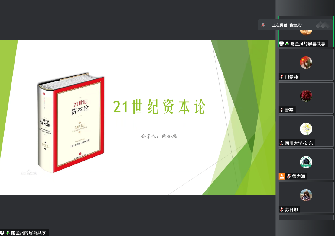 读书报告会分为两个环节,第一个环节两位同学对所选书籍内容及读后感进行分享。首先是鲍金凤同学分享了托马斯.皮凯蒂的著作《21世纪资本论》这本书。首先谈了一下作者著述这本书的背景以及这本书的特点,本书利用历史学家、社会学家、政治学家和经济学家的研究方法研究收入不平等问题。然后,从四个部分,即收入与资本、资本/收入比的动态变化、不平等结构、21世纪的资本监管,分别进行讲解,指出作者的主要观点是收入不平等加剧的最主要因素是由于资本的收益率大于经济增长率,资本集中的程度会日益严重,市场经济无法自发地纠正收入不平等。作者给出的解决方法是在全球范围内征收累进的资本税来遏制全球贫富分化。最后,分享人结合中国的国情谈了一下《21世纪资本论》与中国有什么关系。