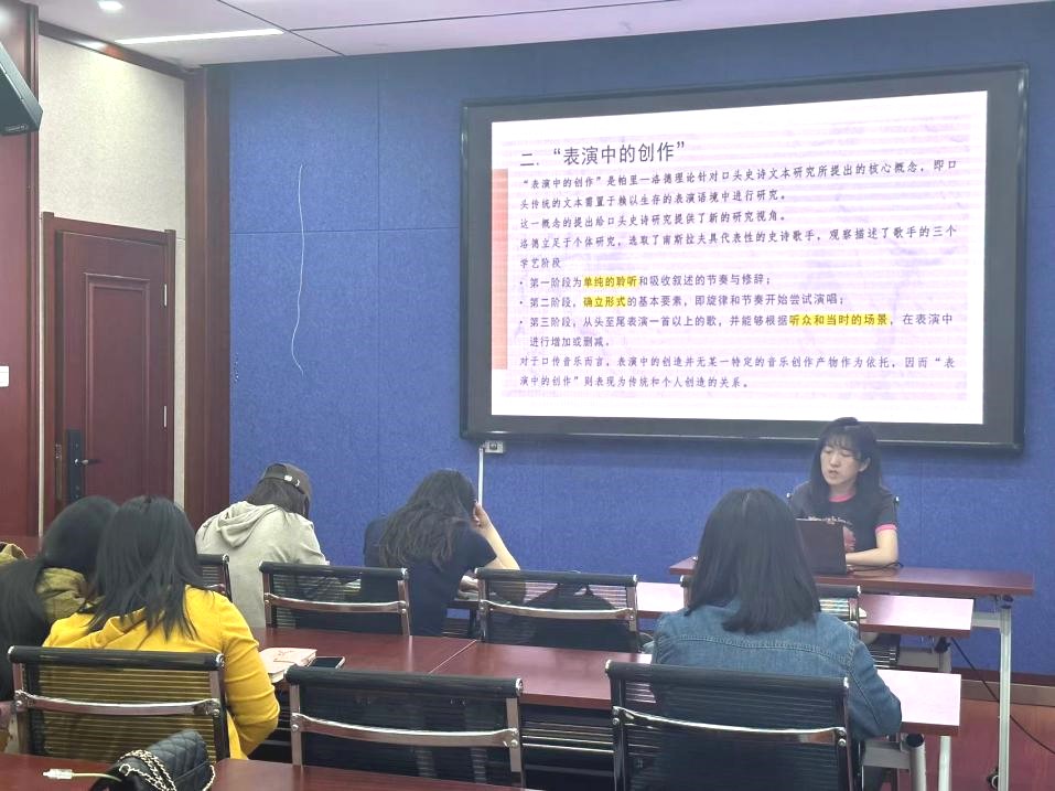 杜峥嵘同学分享了《口头诗学:帕里-洛德理论》,“口头程式理论”是由米尔曼•帕里和阿尔伯特•洛德创立,因此又称为“帕里一洛德理论”。帕里首先关注史诗创作中的程式,程式是史诗多样化的叙事结构、叙事单元的最小的公分母,口头诗歌的语言总体上表现为程式化的传统特点。杜峥嵘同学以诗经中的程式与漫瀚调唱词中的程式举例解释程式的概念,即程式是在漫长的口头表演和流布的历史发展过程中形成的,用于表述某种反复出现的基本观念的相对固定的句法和词语模式。口头理论作为一种方法论,在基本架构上利用现代语言学、人类学研究成果,以史诗本文的语言学解析为基础,论证口头诗歌尤其是史诗的口述性的叙事特点,独特的诗学法则和美学特征。