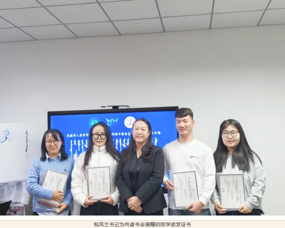 第二阶段是对2024年度读书会的总结。“碧立格”系列读书会中国少数民族史专场能够一直顺利开展,离不开老师和同学的大力支持。“碧立格”系列读书会是bat365中文官方网站于2019年创办的读书活动。长期以来,在本硕博不同层次的学生当中开展,收益很多,也有了一定的影响。“碧立格”系列读书会中国少数民族史专场至今已开办14场,25位师生进行了好书分享。而且,一直以来获得国家项目的教师和获得国家奖学金的同学们在不同程度地为读书会捐赠书籍或资金支持,为同学们提供了更广阔的阅读天地,拓宽了学术视野。在现场由梅荣副教授和那日苏博士分别为近期分享读书心得的6位同学赠送书籍。