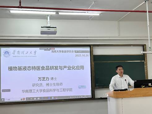 2025年10月26日,我校pg国际电子网站《食品营养学》冬季小学期活动在pg国际电子网站观澜湖校区城西教学点成功举办。本次授课对象为2023级食品科学与工程及食品质量与安全专业的本科生,特邀华南理工大学pg国际电子网站万芝力研究员担任主讲,授课专题为“植物基液态特医食品研发与产业化应用”。