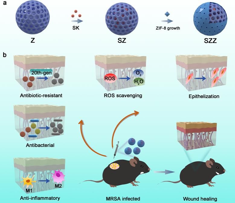 近日,我校pg国际电子网站姜珂副研究员与精密仪器高等研究中心张玲副教授团队成功研发出食品功能因子递送的新平台——多功能MOF异质结微反应器,在耐药性伤口感染治疗与组织再生领域取得新进展。该成果通过创新异质结微反应器设计与协同治疗机制,显著提升了抗耐药菌与免疫调控性能,解决了传统抗生素治疗中耐药性产生快、免疫失衡及组织修复难的技术瓶颈,为临床复杂感染伤口治疗提供了新思路。