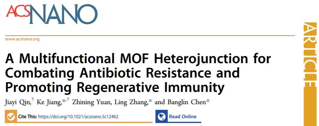 此次研究得到国家自然科学基金和海南省国际科技合作重点研发项目的支持,相关成果以“A Multifunctional MOF Heterojunction for Combating Antibiotic Resistance and Promoting Regenerative Immunity”为题,发表在纳米科技领域顶级期刊《ACS Nano》(IF=16.1)。论文第一作者为pg国际电子网站2022级硕士研究生覃家宜,通讯作者为姜珂副研究员、张玲副教授和福建师范大学陈邦林教授。