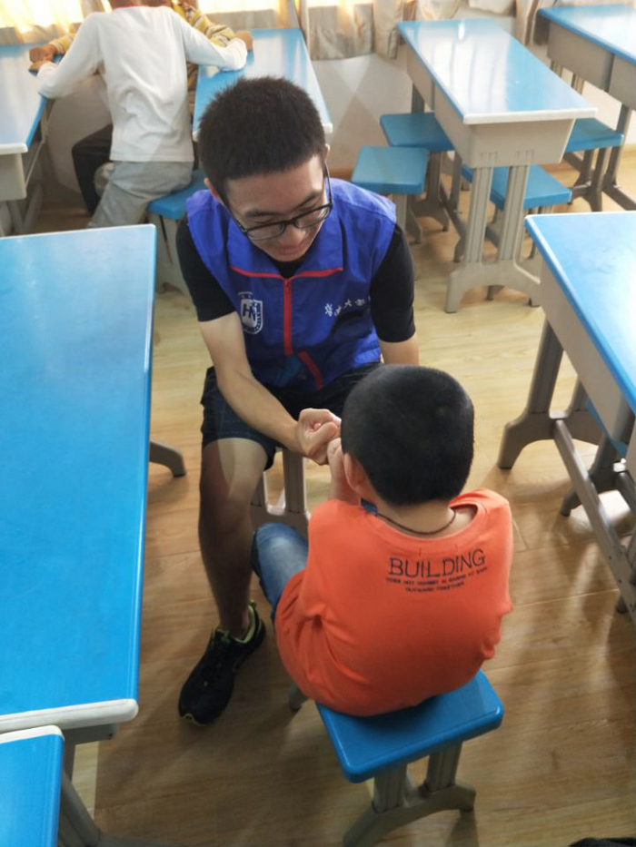 2018年4月24日下午,pg国际电子网站食品学院青年志愿者协会如常前往天翼特教中心,在课堂上协助老师们管理课堂纪律,下课时间与自闭症和智力障碍的儿童一起做游戏。支教的历程中,当遇到其他组织的青年志愿者开展支教活动,双方又会团结协作,一起帮助机构的老师完成教学任务。虽然每次的活动内容基本一致,但是志愿者们面对的孩子却是不一样的,所以志愿者们都会以一个严肃认真的态度去面对每一位自闭症和智力障碍儿童,为他们带去真心实意的关怀。