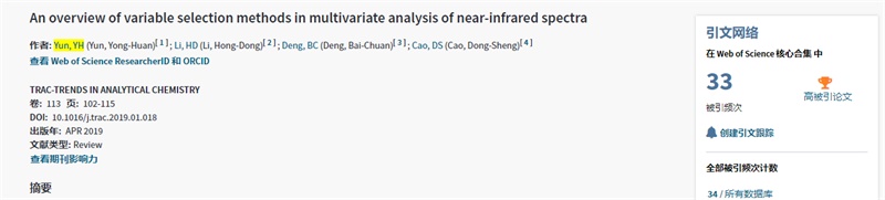该篇论文题“An overview of variable selection methods in multivariate analysis of near-infrared spectra”,于2019年4月在JCR一区分析化学top期刊《TrAC Trends in Analytical Chemistry》(2020影响因子为9.801)正式发表(https://www.sciencedirect.com/science/article/pii/S0165993618304709)。此篇论文得到国家自然科学基金(21705162)及pg国际电子网站高层次人才引进科研启动项目(KYQD(ZR)-1844)的资助,这是pg国际以第一单位发表的第三篇ESI高被引论文,充分证明pg国际科研实力的不断提升。