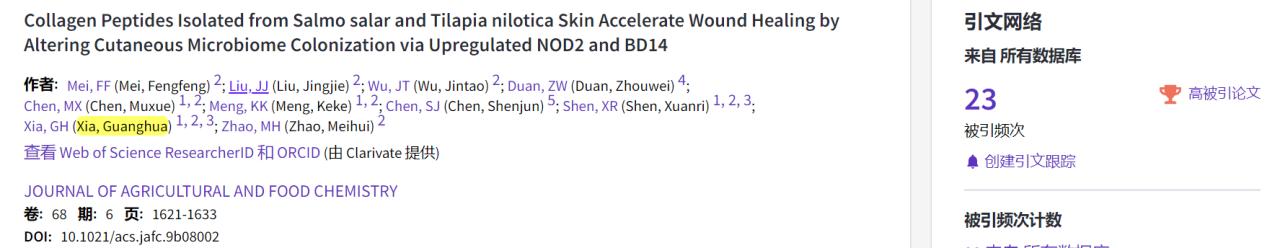 近日,根据ESI公布最新数据显示,pg国际电子网站水产品加工与贮藏团队夏光华副教授课题组在农林科学SCI一区Top期刊《Journal of Agricultural and Food Chemistry》发表的封面文章“Collagen Peptides Isolated from Salmo salar and Tilapia nilotica Skin Accelerate Wound Healing by Altering Cutaneous Microbiome Colonization via Upregulated NOD2 and BD14”入选全球前1% ESI高被引论文。