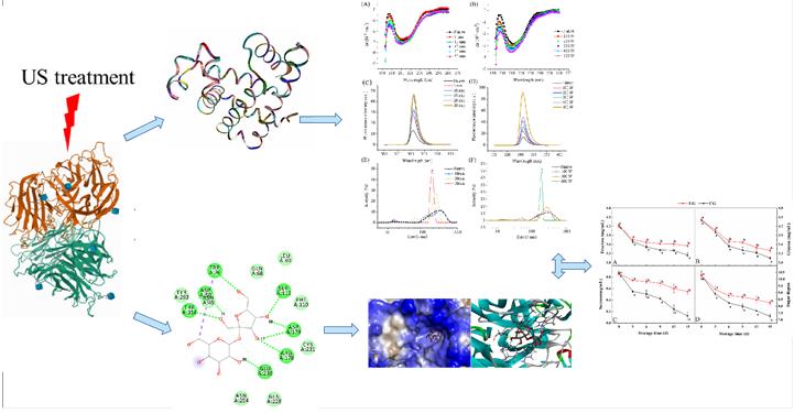 在该研究中,利用频率为20 kHz、功率为2400 W的高强度US处理嫩椰子。与对照组相比,超声处理的椰子水总可溶性固形物含量和糖酸比较高,其中蔗糖、果糖和葡萄糖含量较高,pH值和电导率较低。HS-SPME/GC-MS结果表明,US处理前后椰水中挥发性化合物含量无显著差异,风味没有明显变化。US抑制了蔗糖磷酸合酶、蔗糖合酶、酸性转化酶(AI)和中性转化酶等糖代谢酶的活性,其中AI失活最明显。圆形二色谱和荧光光谱表明,随着超声强度和时间的增加,AI分子的二级和三级结构被破坏,这一点由粒径的变化和扫描电镜证实。分子对接和分子动力学表明,US处理阻止了蔗糖和AI分子的识别和结合,从而抑制了蔗糖的分解。