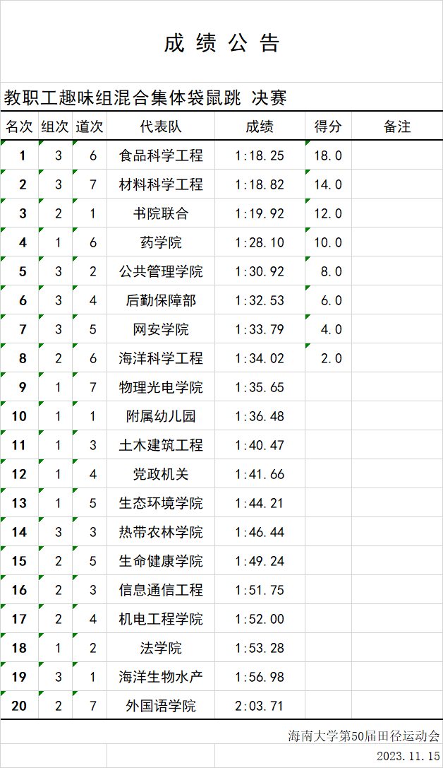 根据pg国际电子网站第50届校运会成绩公告,pg国际电子网站以1:18.25的成绩获得教职工趣味组合混合集体袋鼠跳决赛第一名!