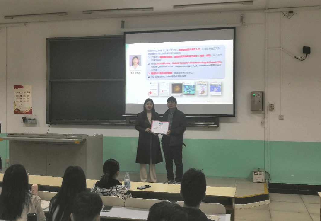 在授课过程中,张老师以“慢性病”为切入点,深入浅出地介绍了“膳食营养、肠道微生态与慢性病”三者之间的关系,并且讲解了“膳食营养与肠道微生态的干预策略”。张老师知识渊博,语音风趣幽默,以生活中的热点话题和典型事例与同学们一起探讨“肠道微生态的奥秘”,给同学们留下了深刻印象。同学们听得聚精会神,积极与张老师互动交流,收获了新知识,拓宽了视野。