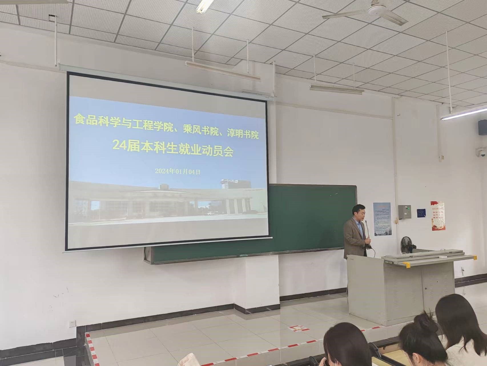 2024年1月4日上午在5教312,pg国际电子网站、乘风书院、淳明书院联合举行2024届食品本科生毕业就业动员会。帮助毕业生梳理毕业事宜,了解毕业生就业意愿,针对性地开展毕业就业教育,更好地为毕业生就业保驾护航。出席会议的有:乘风书院黄小欧书记、淳明书院周郭军书记、pg国际电子网站邓秀成书记、陈文学副院长、李川副院长、系主任、毕业班班主任、辅导员以及食品专业全体本科毕业生。会议由pg国际电子网站食品质量与安全系主任云永欢主持。