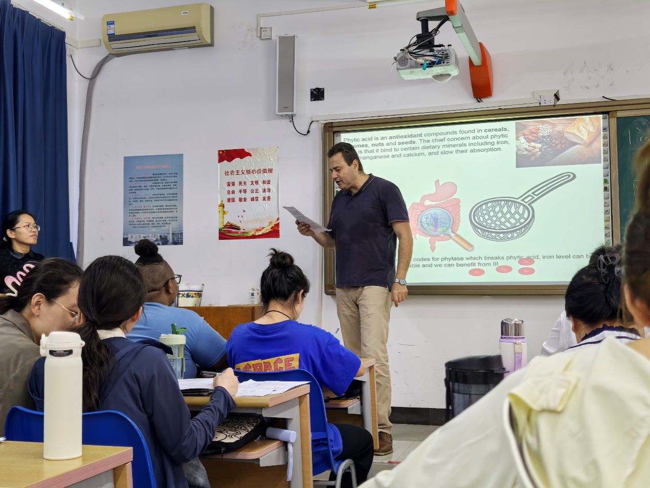 Farag教授从基础的食品化学原理讲起,逐步引入复杂的反应机制,并利用丰富的案例分析帮助学生们理解。课堂上,Farag教授不仅介绍了食品中主要成分如蛋白质、脂肪和碳水化合物的化学性质,还深入探讨了组学技术在食品化学领域的整合与应用。在互动环节中,Farag教授鼓励学生们提出问题并分享自己的见解。他强调,科学研究必须与实际应用结合,高级食品化学的发展不仅关乎科学本身,也深刻影响着我们的日常饮食和健康。因此,学生们在讨论中积极发言,展现出对食品科学未来的关注与思考。此外,Farag教授还分享了自己在食品化学领域的最新研究成果,包括代谢组学在监测食物肠道菌群相互作用结果中的应用,这进一步激发了同学们的科研兴趣。他的经验和见解为学生们提供了宝贵的学习机会,也为pg国际电子网站的食品科学课程注入了新的活力。