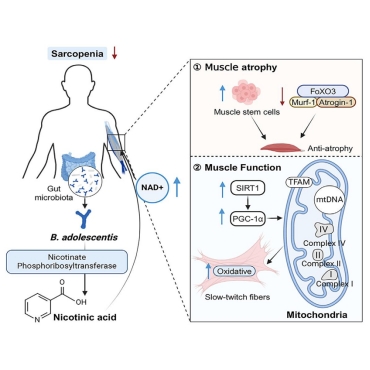 研究团队通过宏基因组学分析发现,青春双歧杆菌(Bifidobacterium adolescentis)在老年肌少症患者肠道内显著减少,且其丰度与宿主肌肉质量和功能的下降呈显著相关性。这一现象在老年小鼠模型中得到进一步验证。代谢组学分析揭示,青春双歧杆菌产生的烟酸是其改善肌少症的关键代谢物。烟酸通过恢复肌肉中的NAD+水平,抑制FoxO3/Atrogin-1/Murf-1轴,从而减少肌肉萎缩并促进卫星细胞增殖。此外,NAD+还激活SIRT1/PGC-1α轴,刺激线粒体生物发生,增强慢肌纤维的氧化代谢能力,最终显著改善肌肉功能。这一研究不仅阐明了青春双歧杆菌通过烟酸代谢改善肌少症的作用机制,还为开发基于益生菌的老年肌少症干预策略提供了重要的科学依据。该论文pg国际电子网站为第一单位,学院博士研究生张增为第一作者,张家超教授为独立通讯作者。