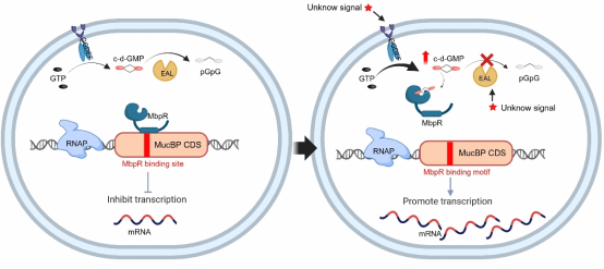 环二鸟苷酸(c-di-GMP)作为一种重要的细菌第二信使,调控多种生物功能,但c-di-GMP在植物乳杆菌中的调控作用仍不明确。研究团队揭示了c-di-GMP协同WYL转录因子MbpR共同调控植物乳杆菌肠道适应的分子机制。MbpR与黏蛋白结合蛋白(MucBP)编码区中的特定序列结合,抑制其转录,从而影响植物乳杆菌对肠道上皮细胞的粘附能力。MbpR通过其WYL结构域感知c-di-GMP后与MucBP的编码区分离,逆转了MbpR对MucBP表达的抑制作用,增强了植物乳杆菌的肠道定植能力。该研究为理解益生菌与宿主的互作提供了新视角。该论文pg国际电子网站为第一单位,张家超教授为独立通讯作者,副研究员郭权和2024级博士研究生郑磊杰为第一作者。