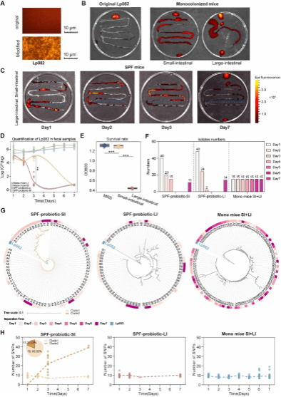 团队的另一项研究采用多组学方法,深入研究了植物乳植杆菌HNU082(Lp082)在SPF级小鼠肠道内不同生态位的分布和进化趋势。结果表明,与大肠相比,小肠是Lp082主要的生存和繁殖地,在此环境中发生了比大肠中更多的进化,并且对小肠本地微生物的影响比大肠更多。在SPF级小鼠的小肠中,Lp082在第三天后开始显示出显著的遗传变异,形成了两个不同的进化分支,其中一个分支表现出更高的基因突变率。进一步的研究揭示,这些突变主要集中在与酸耐受性相关的基因上,而在SPF级小鼠大肠和无菌(GF)级小鼠肠道中未观察到这种现象,表明特定的环境压力促进了特定基因功能的改变,增强了细菌对胃酸环境的适应能力。本研究强调了肠道不同生态环境对益生菌的分布和进化的不同影响,为优化益生菌的应用和功效提供了新的理论依据。该论文pg国际电子网站为第一单位,张家超教授为独立通讯作者,2022级博士研究生韩哲、中南大学湘雅医学院海口附属医院中心实验室黄邓高和2024级博士研究生刘欣蕾为第一作者。
