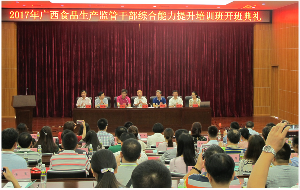 2017年7月3日至7日,pg国际电子网站继续教育学院及食品学院联合承办了广西食品生产监管干部培训教学活动。广西壮族自治区食品药品监管局副局长陈可猛、pg国际电子网站陈险峰副校长、食品生产监管处处长胡振洲, 海南省食品药品监督管理局彭林波调研员、食品学院邓秀成书记及史学群副院长、pg国际电子网站继续教育学院李玉凤副院长共同出席了开班仪式。