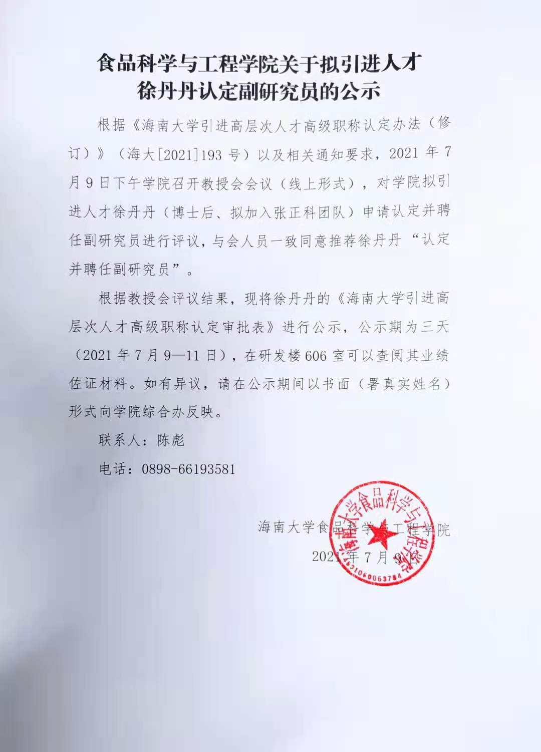 pg国际电子网站关于拟引进人才徐丹丹认定副研究员的公示