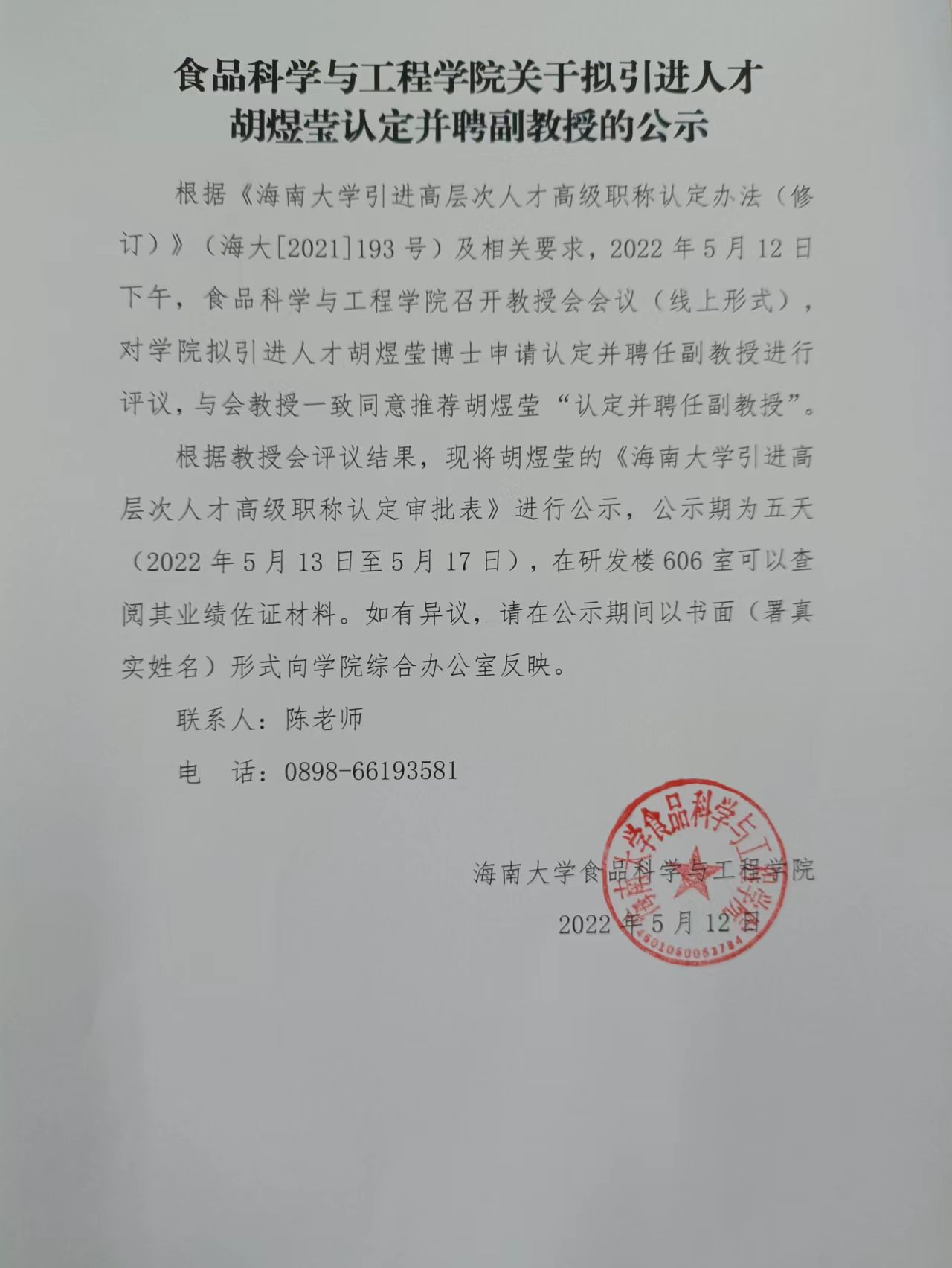 pg国际电子网站关于拟引进人才胡煜莹认定并聘副教授的公示